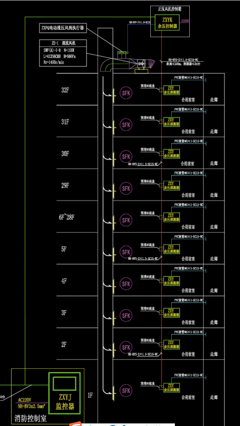ZXYJ智能型餘壓監控係統(tǒng)由ZXY餘壓探測(cè)器、ZXYK餘壓控製器、ZXFQ電動(dòng)泄壓風閥執行器、引壓氣管、ZXYJ餘壓監控器及係統監控專用軟件等(děng)部分或全部設備組成(chéng)。係統安裝方便(biàn)、結構簡單,在出廠前嚴(yán)格通過120小(xiǎo)時的高溫老化,工作穩定可靠,滿足GB51251《建築防煙排煙係統技術標準》、GB50016《建(jiàn)築設計防(fáng)火規範》和GB50098《人民防空工程設計(jì)防火規範》等相關(guān)國家標準中的功能需求。